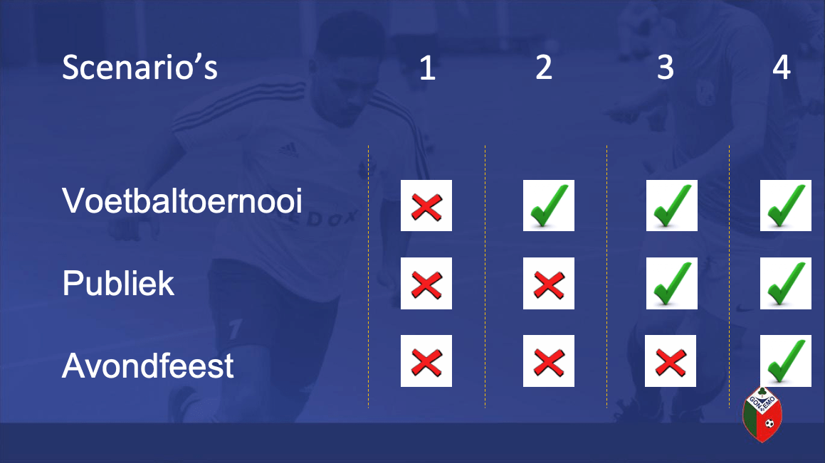 Zoals op verschillende nieuwskanalen te lezen is, is het mogelijk dat er een 2G-beleid komt. 2G betekent dat het niet meer mogelijk is om te testen voor toegang voor niet-essentiële winkels, de horeca en (sport)evenementen. Enkel gevaccineerde mensen of mensen met een herstelbewijs hebben dan toegang. Om dicht bij onze kernwaarden (verbondenheid, betrokkenheid en respect) te blijven en de gemeenschapsfunctie die deze dag heeft, is er besloten door de commissie dat wanneer het 2G wordt ingesteld door de overheid, het toernooi niet doorgaat.Alternatief scenario